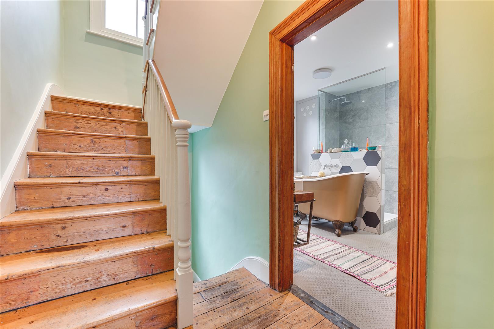 One of the most striking rooms of the house is the bathroom, which lies at the rear of the first floor. The centre piece of the room is the roll top soaking tub by Albion Baths and the shower is bordered beautifully by porcelain tiles. The original master bedroom is next to the bathroom and has two large wooden sash windows, original wood floors and fireplace.