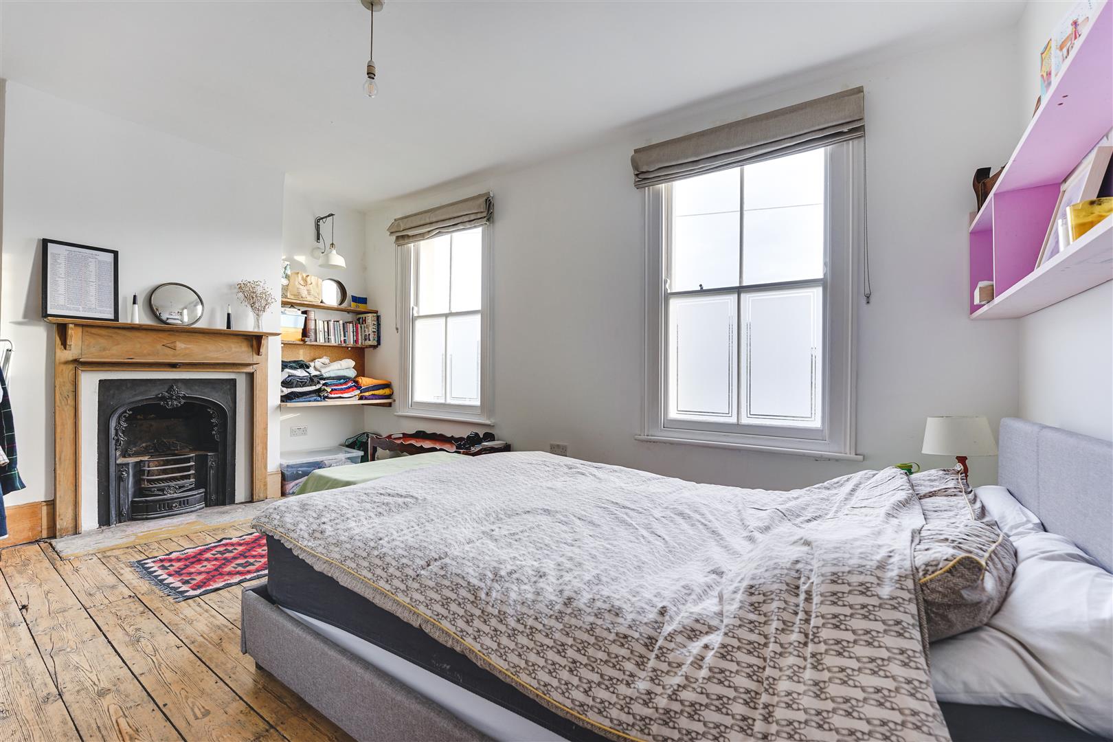 Two further bedrooms lie on the second floor. The master bedroom benefits from vaulted ceilings, two wooden sash windows which allow natural light to pour through. Original wooden floors and an en-suite shower room have been added very tastefully. The third bedroom lies adjacent with exposed brick walls and fitted wooden bookshelves.